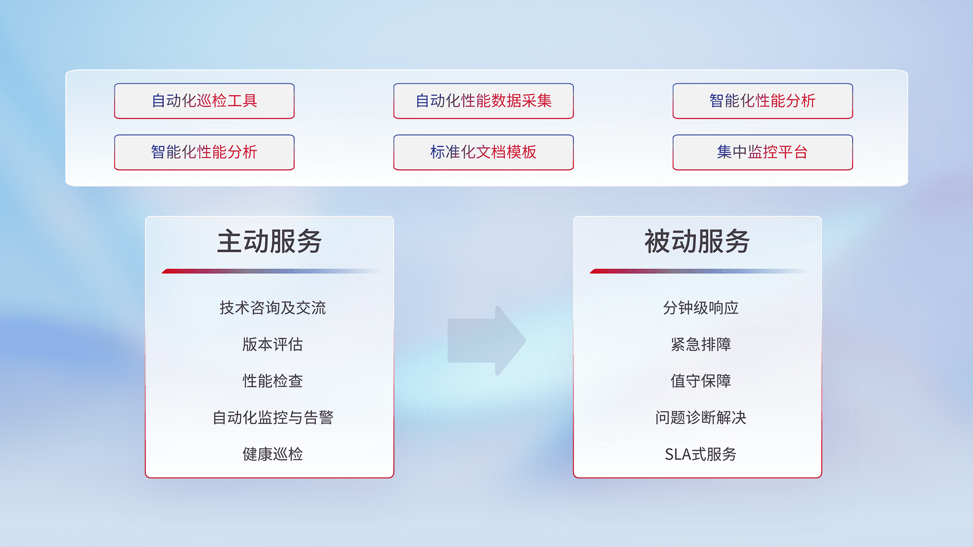 智能化工具和标准化文档,,,,保障服务质量,,,提供主动服务(包含技术咨询、、、、版本评估、、、性能检查、、、、自动化监控与告警、、健康巡检)和被动服务包含(分钟级响应、、、紧急排障、、、值守保障、、、、问题诊断解决、、、、SLA服务)。。