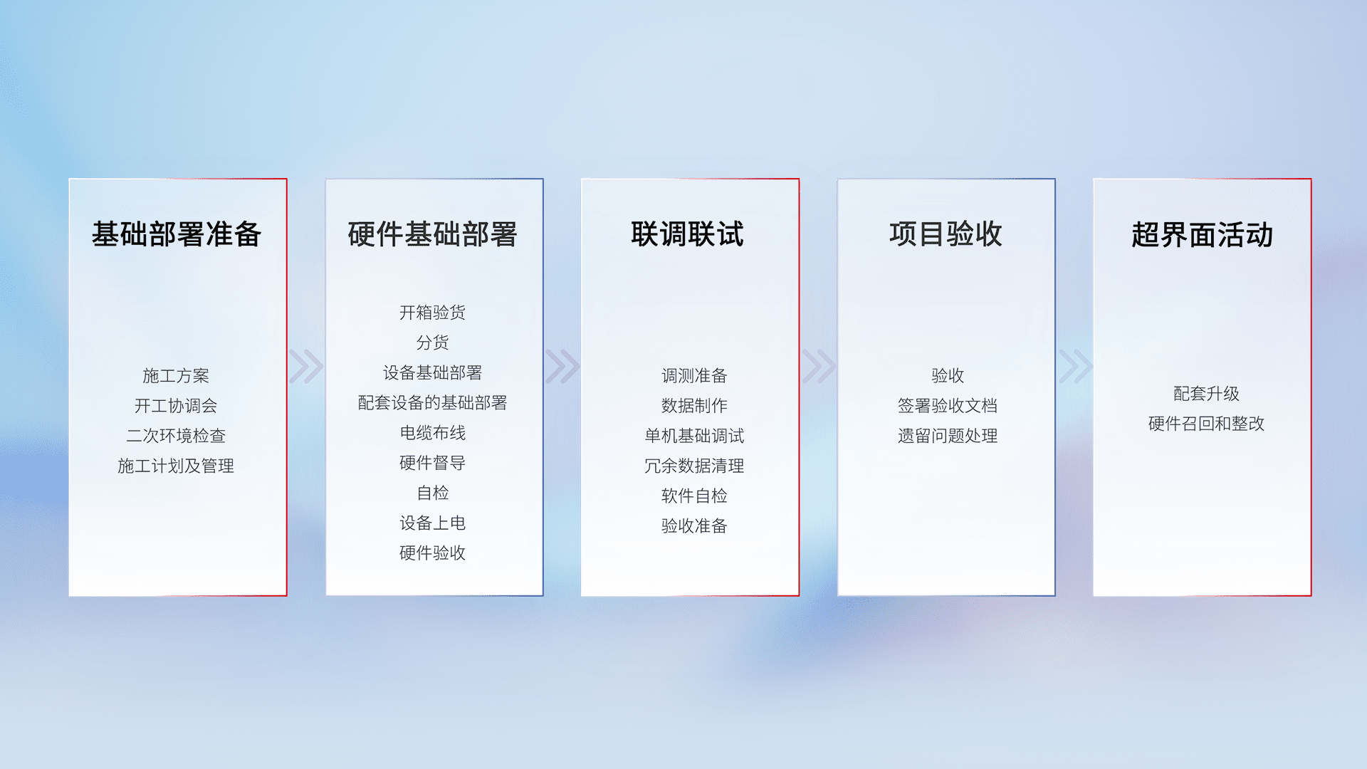 从基础部署准备、、、、硬件基础部署、、、、联调联试、、、项目验收、、越界面活动的全过程可追溯,,保证施工质量和进度。。。
